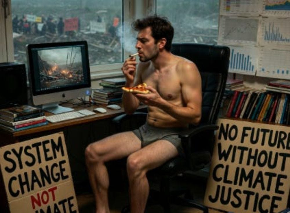 Creating a meaningful life and finding ways to be proactive environmentally is not the same as having hope. Hopelessness does not imply inaction. It is simply incorrect to suggest that doomers are inactivists, that they spend their waking hours sitting in front of a computer in their underwear, smoking joints and eating pizza, while ignorantly mocking climate scientists for not stating how fucked we really are. To me, being a doomer means being an activist, just with more reasonable expectations. And plenty of climate scientists are stating how fucked we are. Case closed.