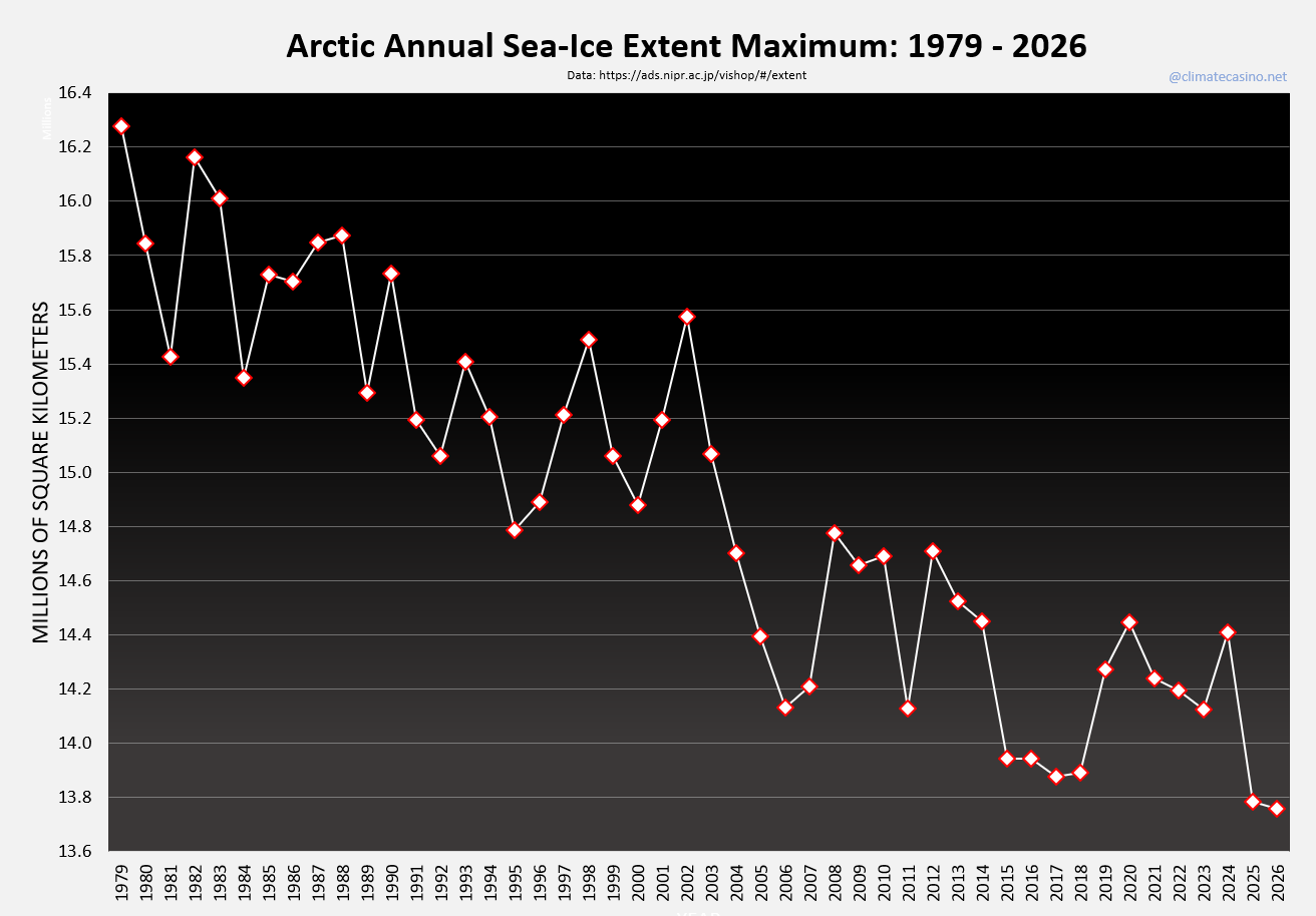 Arctic sea-ice extent hits its yearly maximum each year in late February to mid-March. This year saw a record low maximum, beating the previous record low maximum, set just last year, by just over 25,000 square kilometers.
