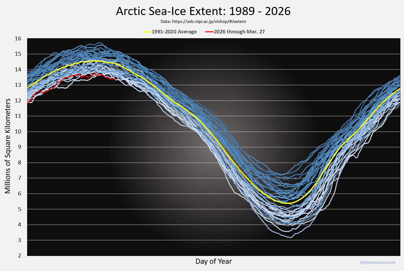 Arctic sea-ice has set a new record low extent for the past 13 days in a row, with the latest data for March 27th coming in at more than 23,000 square kilometers below the previous record low for the day.