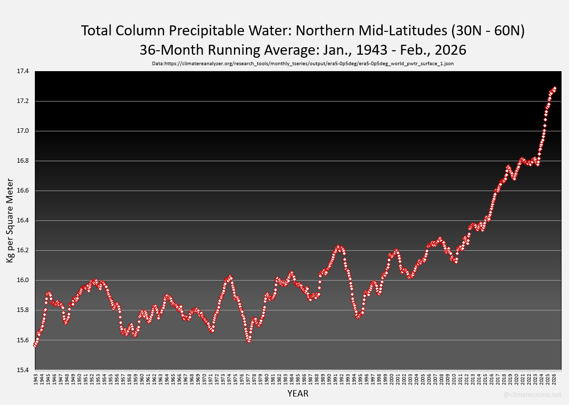 The graph below shows the latest data, from February, 2026 for the Northern Mid-Latitudes, where about 50% of humans live. Car soup time.