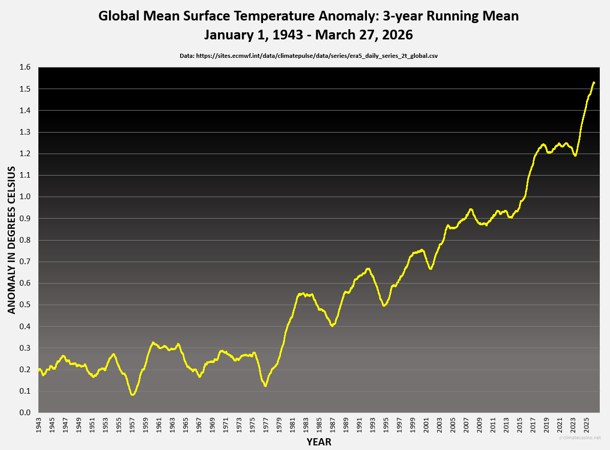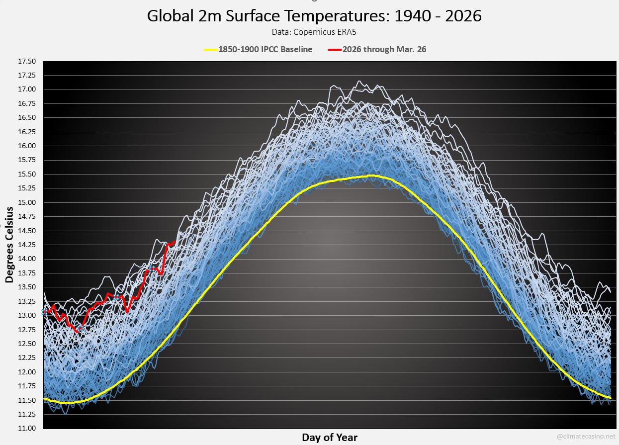 Althought not at an all-time high, the latest temperature, from March 26th, is the hottest March 26th on record since 1940, at about 1.55°C above the 1850-1900 IPCC pre-industrial baseline.
