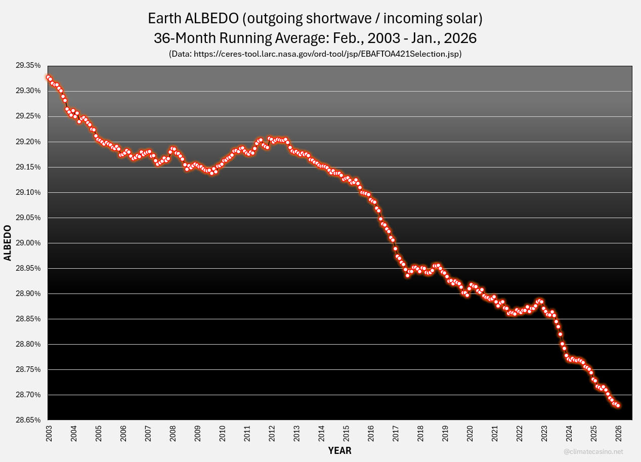 I compute Earth albedo (reflectivity) using CERES data, which runs a couple of months behind. The latest data available is from January, 2026. This data shows a new record low for Earth albedo. The primary driver of the loss of albedo is change in cloud cover and loss of sea-ice.