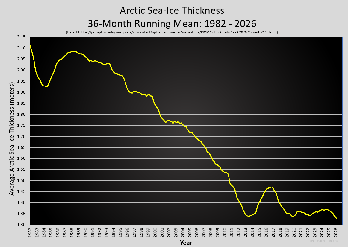 As of that latest data through February, 2026, the 36-month running mean for Arctic sea-ice thickness is at a record low. Aside: the most recent 36-month running mean for volume is not at a record low.