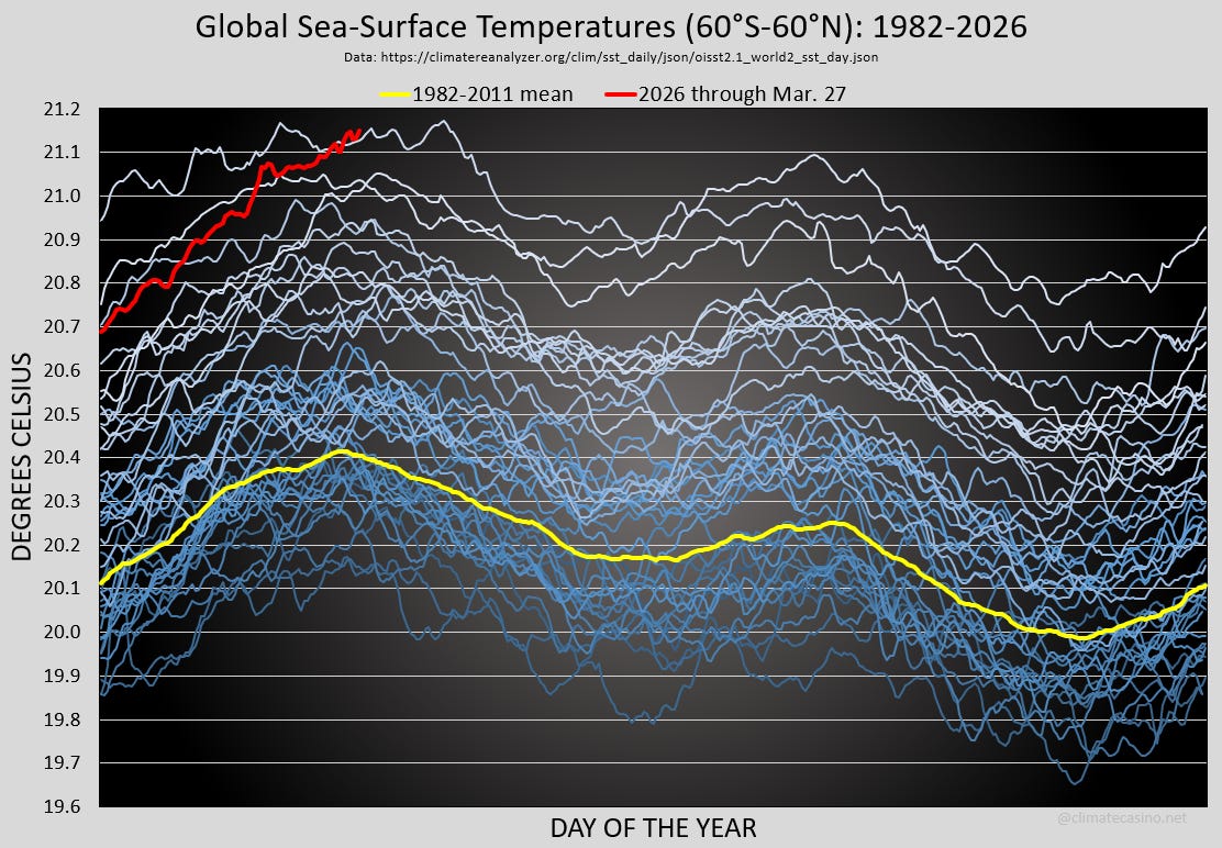 The global sea-surface temperature (SST) set a daily high as of the latest data, from March 27th, at a preliminary temperature of 21.149°C. SST’s are “preliminary” for about 2 weeks, so we won’t know for sure until the 2nd week of April.